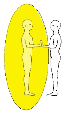 En las ilustraciones 14a y 14b de las páginas siguientes, verás al Yo Superior uniéndose a ti al conectar las palmas de sus manos con las tuyas. Luego se conectan los chakras al conectarse la parte anterior del cuerpo de tu Yo Superior con la parte posterior del tuyo. En el primer estadio, mientras las palmas de las manos se tocan, se establece un flujo de energía desde el Yo Superior hacia tu cuerpo a través de las manos.